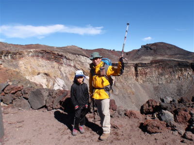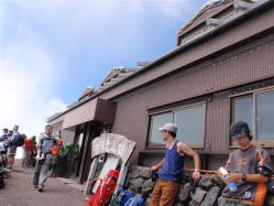 | 孫が今年になって何を思ったか富士山に登りたいと言い出した。そこで月一回(計5回)のペースでトレーニングを開始した。 富士登山当日、お盆明けの平日6時にもかかわらず車の列が延々と続き、2150mからのスタートとなる。高度順応を考え、スローペースで登る。しかし、3000m当りから吐き気を訴える。酸素を吸いつつ、休憩をこまめに取り、赤岩八号館に到着。すぐに布団の中に沈没(2時間ほど爆睡) 翌朝、体調は戻るが山頂までの足取りは重く、やっとのことで頂上に立つことが出来た。下りに入ると徐々に回復し、何と山頂奥宮から富士宮登山口まで2時間で下山してしまった。私は息を切らし付いて行くことがやっとだった(5分遅れ)つくづく歳を感じさせられた。 二日間天候に恵まれ(小屋のオーナーによると、この夏一二番の天気だとか)どうにか当初の目的を達成することが出来た。 天 候:8月20日(快晴一時霧)〜21日(快晴) コース:1日目 2.150m⇒富士宮登山口2.400m⇒雲海荘2.500m⇒宝永火口⇒宝永山2.693m⇒御殿場ルート⇒赤岩八号館3.300m 2日目 赤岩八号館3.300m⇒御殿場口頂上⇒剣ヶ峰3.776m⇒富士宮口頂上⇒富士宮ルート⇒富士宮登山口2.400m⇒2.150m |