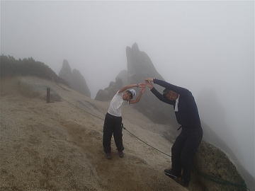 ![]() ガスの中を燕岳へ。 燕岳山頂にて。 |