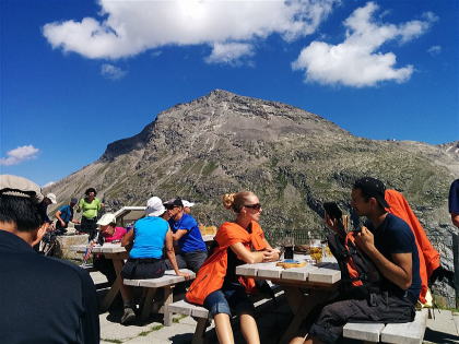 ![]() 早速生ビールで乾杯! 大半の人はトレッキングでボーバルヒュッテ(2,495m)に |