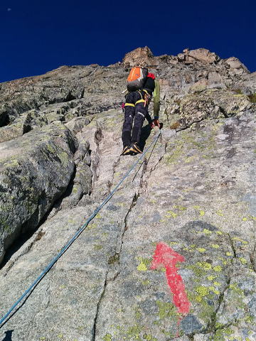 8月6日 2時起床、簡単な朝食を済ませて4時小屋を出発する。やがて夜が明け始め、振返ると後ろの山から昇る朝日を目にすることが出来る。 と同時に目の前の山々がモルゲンロートで真っ赤に染まる。始めはガレ場を進み、次にクライミング(3級〜3級+)で岸壁を登り、やがて雪原に出る。 ここでアイゼンを装着してピッツ・モルテラッチに向かう。 |